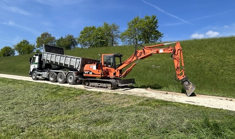 Den Bagger setzten wir ein, um die Seitenbereiche der Wege abzutragen und das Bankett in die gewünschte Form zu bringen. Dadurch wird sichergestellt, dass das Wasser stets effizient von der Strasse abfliessen kann und die Strasse nicht beschädigt.